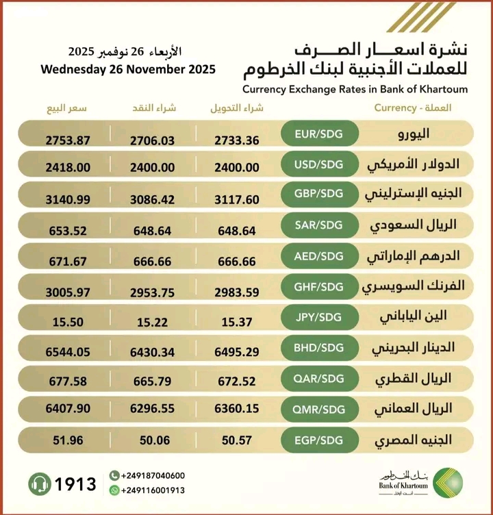 أظهرت نشرة بنك الخرطوم استقرارًا نسبيًا عند مستويات أقل مقارنة بنظرائه، حيث حدد البنك أسعاره كالتالي:الدولار الأمريكي: 2400.00 جنيه للشراء (نقدًا وتحويلاً)، و2418.00 جنيه للبيع.