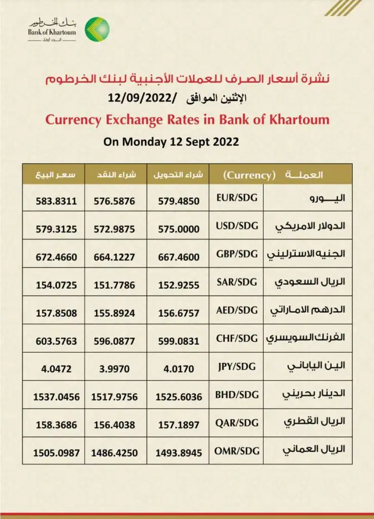 واصلت أسعار العملات الأجنبية مقابل الجنيه السوداني استقرارها اليوم الإثنين واستقر سعر الدولار في بنك الخرطوم على أسعار أمس الأحد ,كأعلى سعر مقدم عند 579 للبيع و 572 للشراء و 575 للتحويل , فيما تباينت اسعار العملات انخفاضا في بقية البنوك