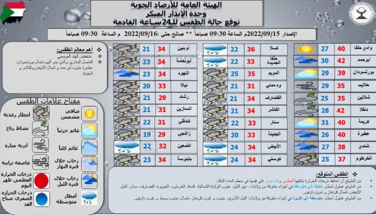 وتوقعت وحدة الإنذار هطول أمطار متوسطة الى خفيفة في أجزاء متفرقة من ولايات نهر النيل، جنوب الولاية الشمالية، كسلا، الخرطوم، الجزيرة، القضارف، سنار، النيل الأبيض، شمال كردفان وشرق دارفور.
