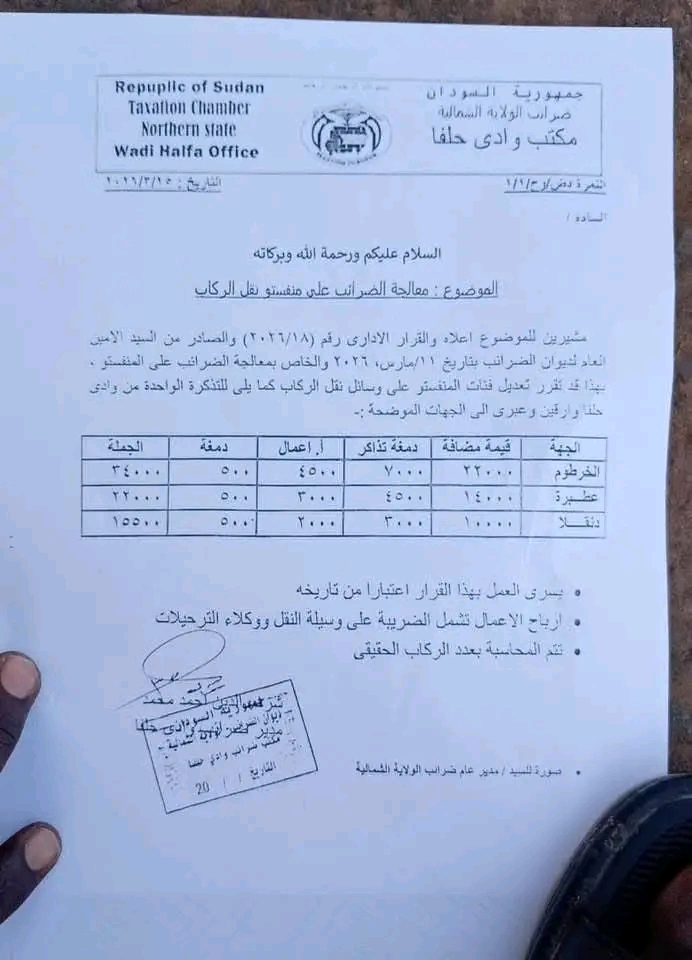 هل تعلم يا هداك الله، أن ضرائب وادي حلفا تُفرض على رأس كل مواطن في المعابر “قيمة مضافة، ودمغة تذاكر، وأرباح أعمال، ودمغة أخرى”، حيث تبلغ القيمة الإجمالية من حلفا إلى الخرطوم في ترحيل كل مواطن ٣٤ ألف جنيه، وإلى عطبرة ٢٢ ألف جنيه، وإلى دنقلا ١٥.٥ ألف جنيه.