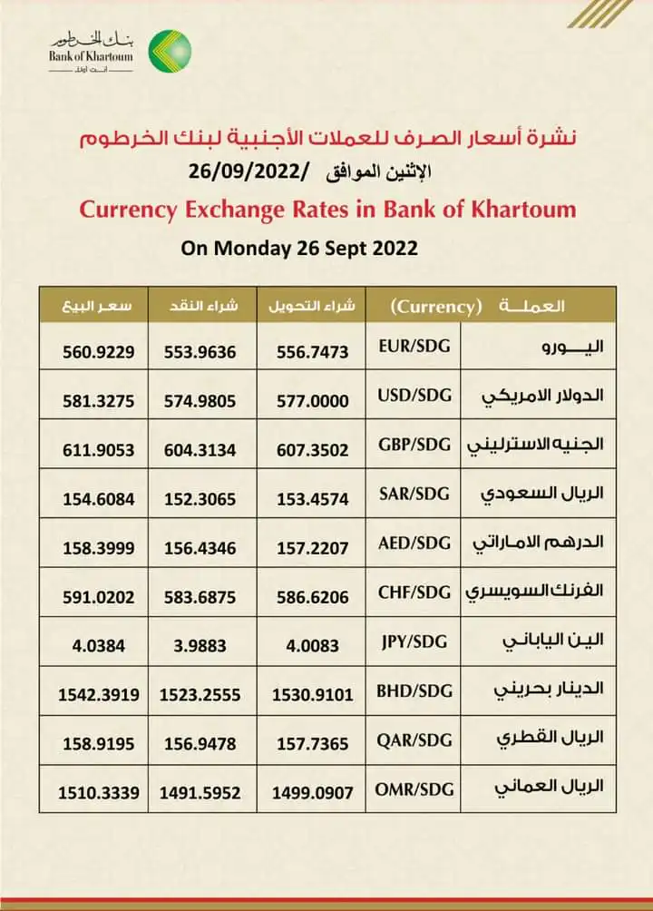 واصلت أسعار العملات الأجنبية مقابل الجنيه السوداني استقرارها حيث استقر سهر صرف الدولار في بنك الخرطوم كأعلى سعر مقدم من البنوك المحلية عند 577 للتحويل و 574 للشراء و 581 للبيع