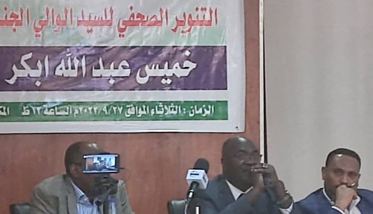 عقد والي ولاية غرب دارفور خميس عبد الله ابكر تنويرا صحفيا في فندق القراند هوليداي بالخرطوم اليوم أكد فيه استمرار جهود حكومة الولاية في بحث ارساء دعائم السلاموالتعايش السلمي