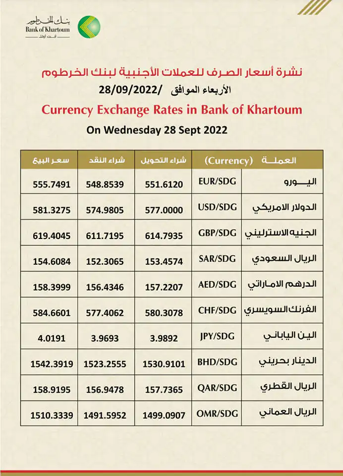 استقر سعر الدولار في بنك الخرطوم عند 581 كأعلى سعر مقدم من قبل البنوك المحلية بينما استقر في بنك فيصل الإسلامي عند 577 و 580 في بنك أمدرمان الوطني