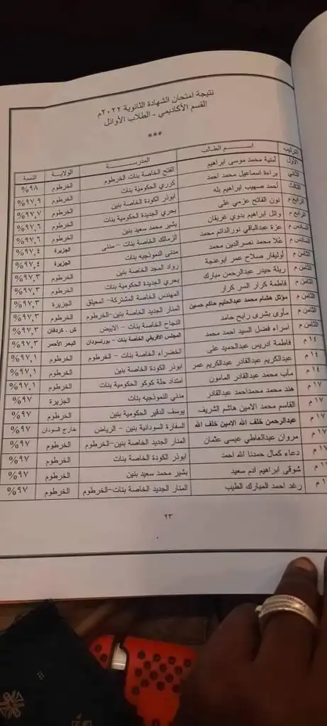 أعلنت اليوم نتيجة امتحانات الشهادة السودانية وزير التربية والتعليم محمود الحوري نتيجة الشهادة السودانية اليوم الخميس عبر مؤتمر صحفي بقاعة التعليم العالي و أحرزت الطالبة النابغة أمنية محمد موسى إبراهيم المدرسة من مدرسة الفتح الخاصة بولاية الخرطوم المركز الأول بنسبة 98%