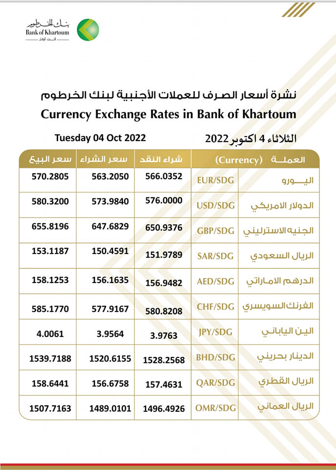 أسعار العملات الأجنبية مقابل الجنيه السوداني اليوم الثلاثاء 4 أكتوبر