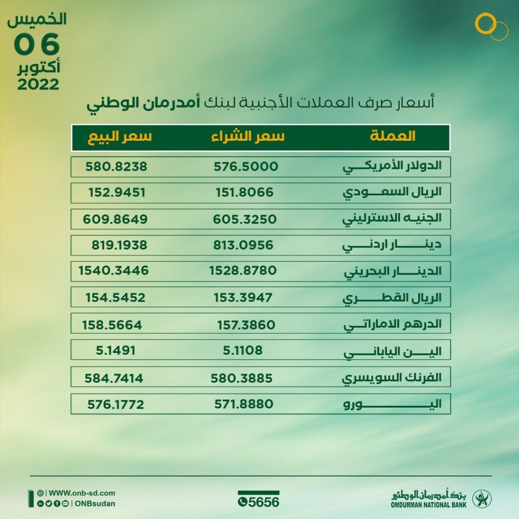 تباينت أسعار العملات الأجنبية مقابل الجنيه السوداني خلال تعاملات اليوم الخميس 6 أكتوبر في مختلف البنوك السودانية .غير أنها استقرت مرتفعة منذ افتتاحية هذا الأسبوع حيث استقر سعر الدولار الأمريكي عند 577جنيها للتحويل بينما بلغ سعر الشراء 574 و 581 للبيع كأفضل سعر مقدم من البنوك .