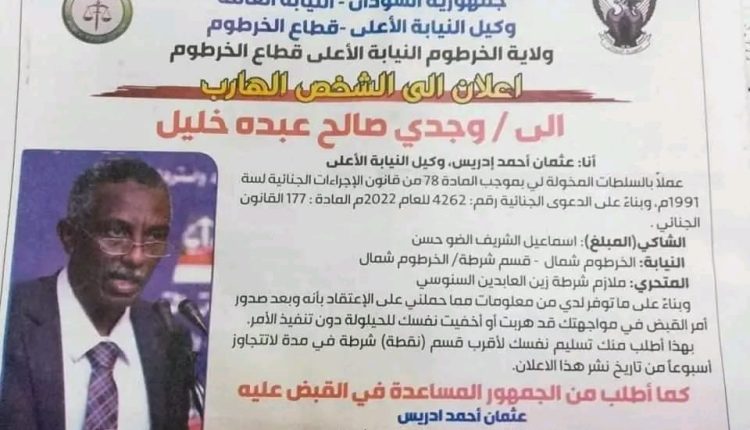 أعلن وكيل النيابة الأعلى بالخرطوم عضو لجنة إزالة التمكين المحلولة وجدي صالح متهما هاربا مناشدا الجمهور بالمساعدة في القبض عليه.