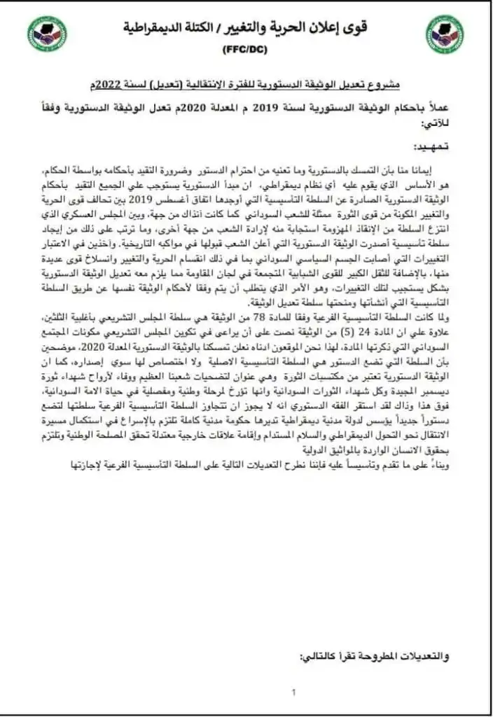 بمشاركة ممثلين من بعثات دبلوماسية وعدد من الكيانات والاحزاب اعلنت قوى الحرية والتغيير التكتل الديمقراطي عن مشروع تعديل الوثيقة الدستورية للفترة الانتقالية تعديل لسنة 2022م
