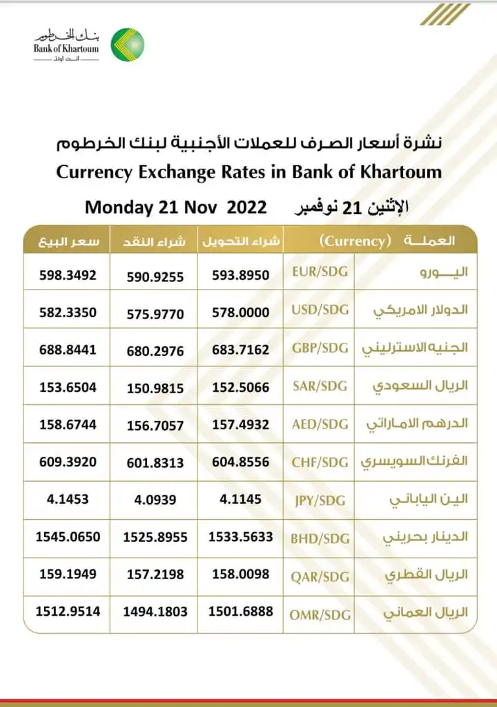 أسعار العملات الأجنبية مقابل الجنيه السوداني اليوم الإثنين 21 نوفمبر 2022م