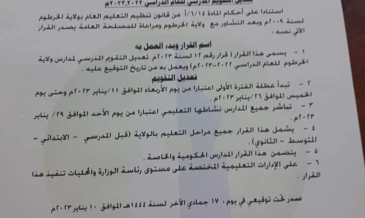 أعلنت وزارة التربية والتعليم ولاية الخرطوم تعديل التقويم المدرسي للعام 2022_2023م وفق القرار الاداري رقم (12) لسنة 2023م استناداً على أحكام المادة 14 /6/أ من قانون تنظيم التعليم العام بولاية الخرطوم لسنة 2009 م .