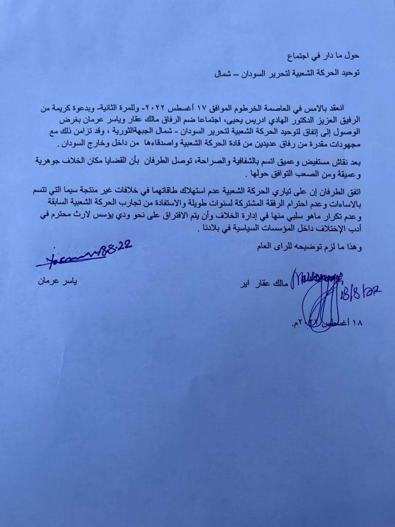 وأضاف البيان الصادر عنهما: “اتّفق الطرفان أن على تياري الحركة الشعبية عدم استهلاك طاقاتهما في خلافات غير مُنتجة، سيّما التي تتّسم بالإساءات وعدم احترام الرفقة المُشتركة لسنوات طويلة، والاستفادة من تجارب الحركة الشعبية السابقة وعدم تكرار ما هو سلبي منها في إدارة الخلاف، وأن يتم الافتراق على نحو ودِّي يُؤسِّس لإرث مُحترم في أدب الاختلاف داخل المؤسسات السياسية في بلادنا”.
