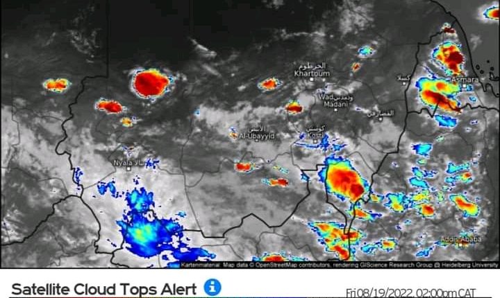 أفادت الهيئة العامة للأرصاد الجوية عن ظهور سحب ركامية في عدد من الولايات اليوم وقالت في تنويه عاجل لها أن صور الأقمار الصناعية تظهر انتشارًا متفرق للسحب الركامية الممطرة  على جنوب ولاية البحر الأحمر، جنوب نهر النيل، شرق ولاية الخرطوم، ولاية النيل الأبيض، النيل الأزرق، شمال، جنوب وغرب كردفان، وعلي ولاية شمال دارفور.