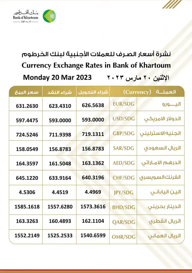 واصلت أسعار العملات الأجنبية أمام الجنيه السوداني استقرارها مرتفعة في البنوك السودانية وبلغ سعر بيع الدولار في بنكي الخرطوم وامدرمان 597 جنيها والشراء 593 جنيها