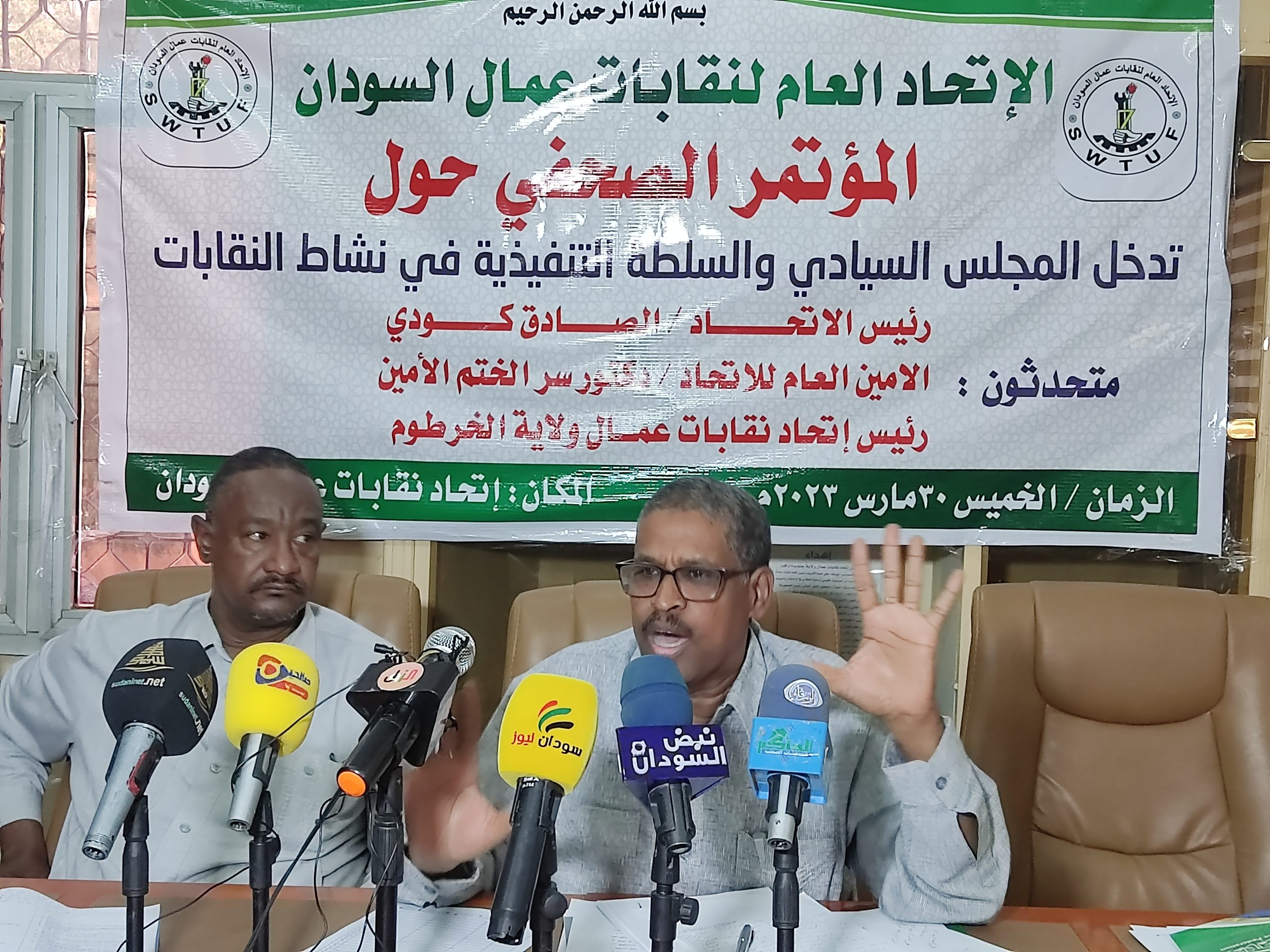 قال رئيس اتحاد عام نقابات عمال السودان :” قدمنا رؤية متكاملة لإدارة البلاد ولم نعرف مصيرها وجلسنا مع عدد من المبادرات منها مبادرة الطيب الجد ومبادرة التجاني السياسي .وأكد توافقهم مع الحوار السوداني السوداني و رفض التدخل الاجنبي في شؤون البلاد. وهدد كودي بالتصعيد النقابي باغلاق المشافي وهيئتي المياة والكهرباء واستخدام غيرها من وسائل الضغط العمالي. وقلل كَودي من وجود النقابات التسيرية لجهة انها غير شرعية وفق قانون العمل للعام ٩٧. ورحب كودي باي جهود للحوار تضم اطراف الانتاج الثلاثي التي يمكن ان تسهم في حل الازمة السياسية السَودانية الماثلة وقال الاستاذ هاشم ان تشظي القوى السياسية وتدخل السفارات والاستخبارات الخارجية انعكس على العمال مستشهدا بولاية غرب دارفور واسكان النازحين بالمرافق النقابية عطل عمل النقابات بها وقال ان الدستور الانتقالي والوثيقة الانتقالية قوانين فاعلة حفظت حق العمال.وزاد، ان الورش المنعقدة باسم العمال نوقشت من قبل لجنة لاتملك حق القرار . وقال الامين العام دكتور سرالختم اننا مع الحق اينما كان ولاندعم اي جهة أجنبية ووصف فولكر بانه المسيح الدجال واعلن عن ترتيبات قادمة تصعيدية لحقَوق العمال وحفظ حقوقهم وقضاياهم وقال ان الاضراب حق مكفول ولكن لا نريد ايقاق دولاب العمل بالدولة لانها متعلقة بالمواطن.محذرا عدم استكانتهم إلى حين أخذ الحقوق وخدم العمال .وقال بخصوص الاتفاق الاطاري سعينا لمقابلة فولكر ورئيس الدولة ورئيس العمل وغيرهم من المسؤولين ولم نجد استجابة. ومن لايريدنا لانريده واذا ارادو حكمنا بقوة القانون نحن على استعداد لها وتابع هناك ناس ركبو الموجة عبر نقابة العمال.