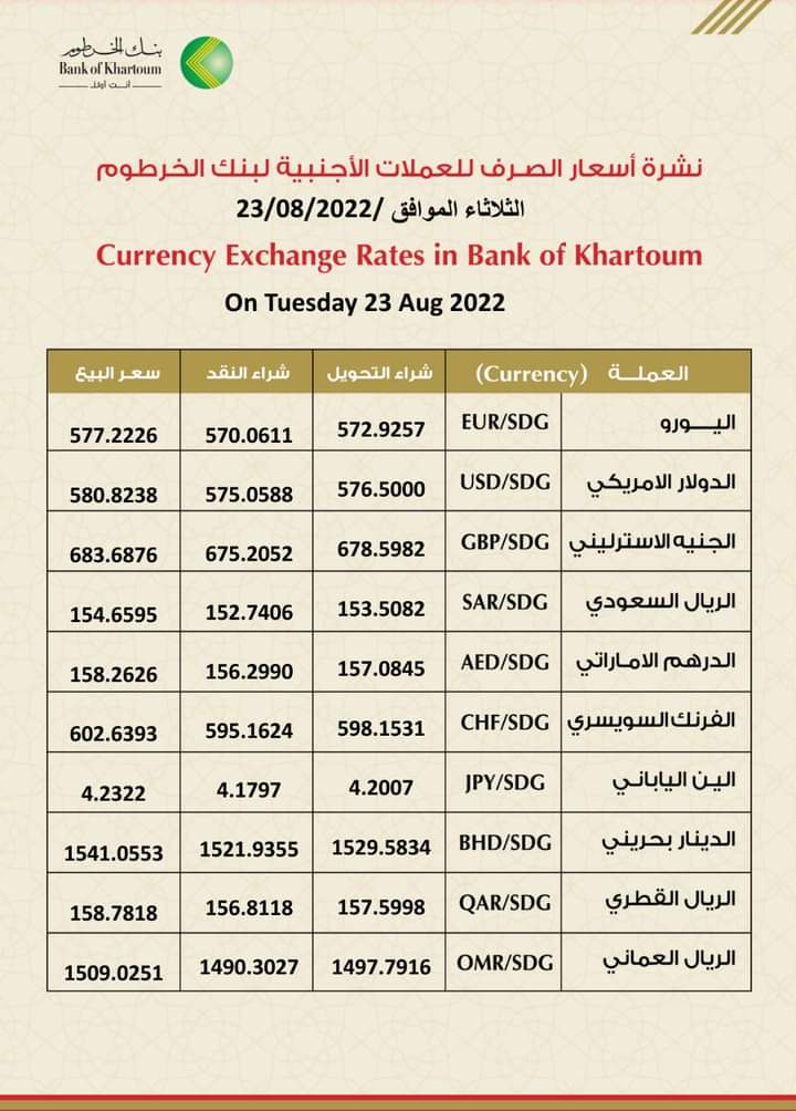 شهدت أسعار العملات الأجنبية مقابل الجنيه السوداني اليوم الثلاثاء 23 أغسطس 2022م ارتفاعًا ملحوظًا في البنوك السودانية حيث ارتفع سعر الدولار في بنك الخرطوم من 574 جنيه للشراء واستقر عند 580 جنيها اليوم