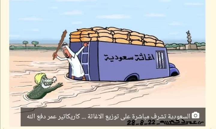 قام الوفد السعودي بالإشراف علي توزيع الإغاثة السعودية بأنفسهم، مؤكد بأن هذه الخطوة ماهي الإ مؤشر مهنم لعدم الثِقة الكافية في إيصال المناديب للإغاثة للمُستحقين من الطائرة مباشر للأماكن المتضررة بالسيول والأمطار بسبب عدم توفر الشفافية، لا مخازن لا جملونات ولا غيره، كاريكاتير أبرز العُقال يحمل عكازاً لِمناوشة التمساح البشري داخل المياه الذي كان ان يبتلع المعونة،