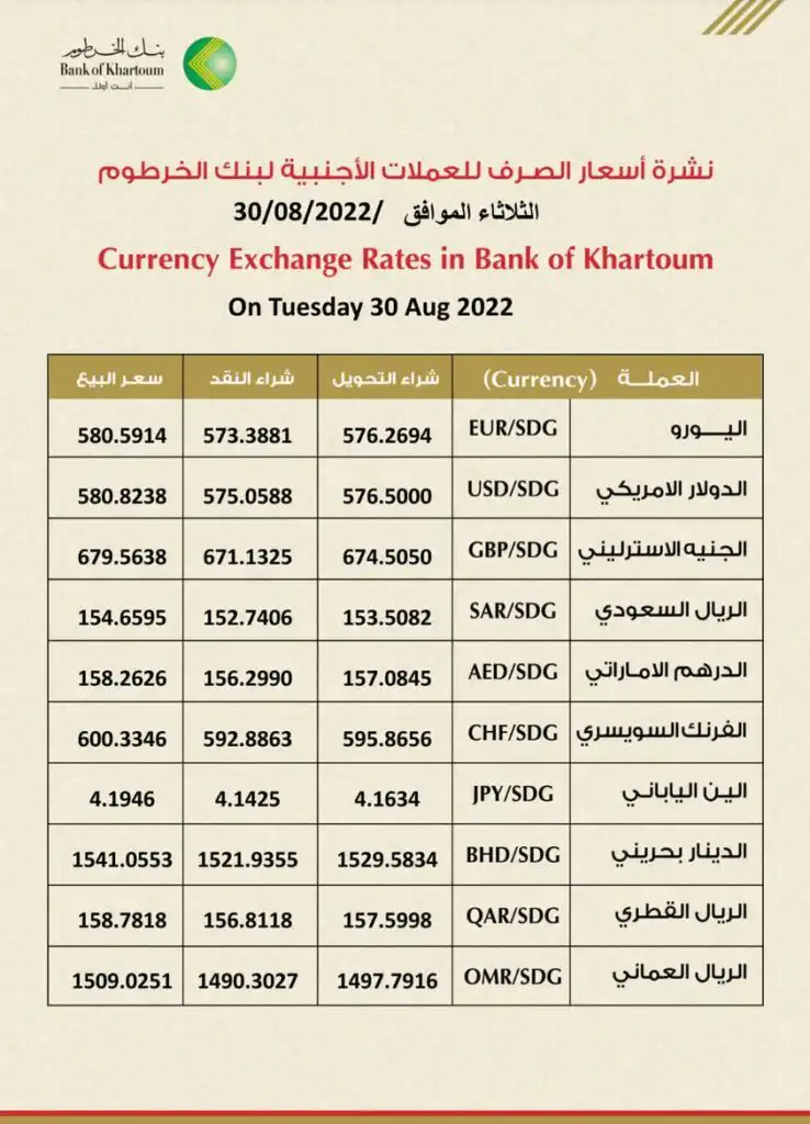 واصلت أسعار العملات الأجنبية مقابل الجنيه السوداني في استقرارها مرتفعة في منتصف هذا الأسبوع اليوم الثلاثاء, حيث استقر سعر الدولار كأعلى سعر في البنوك السودانية عند 576 للتحويل و 575 للشراء النقدي و 580 للبيع وذلك في بنك الخرطوم .