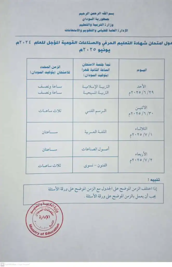 أعلنت وزارة التربية والتعليم السودانية عن جدول امتحانات الشهادة الثانوية للعام 2024، الخاصة بالدفعة المؤجلة، والتي من المقرر أن تبدأ يوم الأحد 29 يونيو 2025 وتنتهي يوم الخميس 10 يوليو 2025.