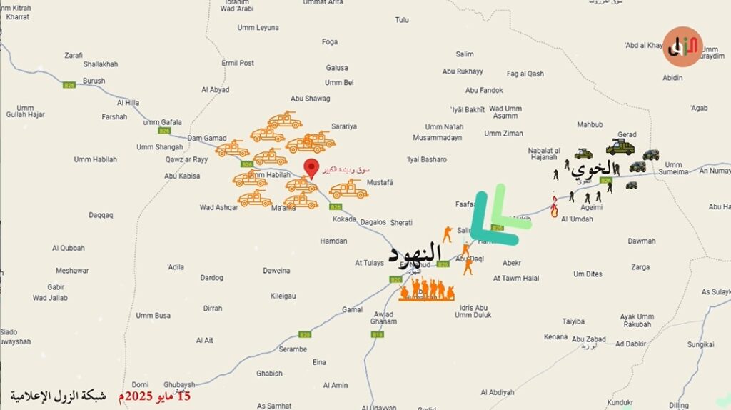 حشدت المليشيا قوات كبيرة في طريق شمال غرب النهود وهو الطريق المؤدي للفاشر قرابة ال ٥٠٠ عربة شوهدت في ود بندة يوم الخميس وتوقع ان تذهب القوة إلى النهود او الخوي وظلوا متواجدين في ود بندة حتى مساء الخميس،وودبندة منطقة تستخدمها المليشيا للحشد والهجوم على النهود والمناطق المجاورة لها.