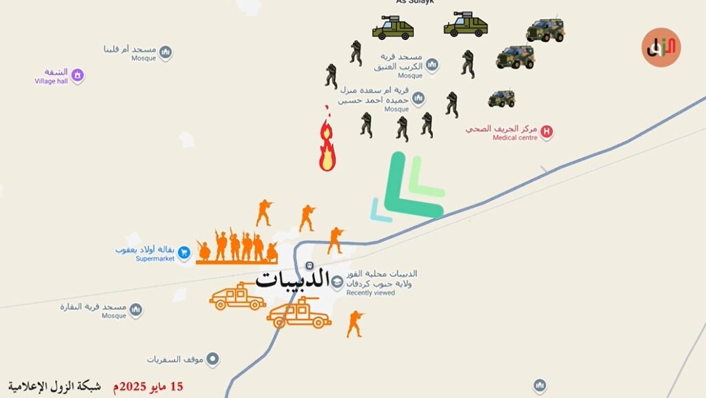 الموقف الحالي لمتحرك الصياد التابع للقوات المسلحة والمتوجه لربط الدلنج بالأبيض اصبح في تخوم الدبيبات والمليشيا نفسها في فيديوهات لحسين برشم وموسى اغيبش جمعت المليشيا كل قواتها في غرب كردفان في مدينة الدبيبات.