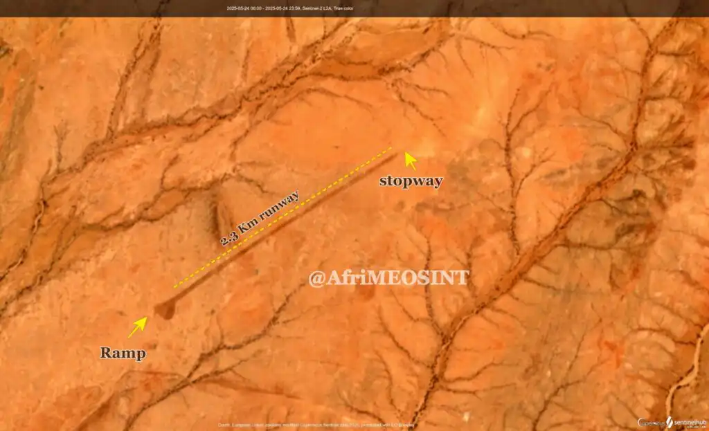 وأوضحت المنصة أن طول المدرج يصل إلى 2.3 كيلومترًا ويتضمن منحدرًا صغيرًا، ما يشير إلى احتمال استخدامه لأغراض عسكرية أو لوجستية متقدمة، في ظل استمرار المليشيا بتلقي دعم خارجي عبر مسارات غير تقليدية.
