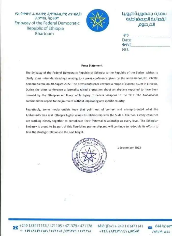 وقالت السفارة في بيانها أن السفير الإثيوبي أجاب على سؤال حول الطائرة التي تم اسقاطها دون الإشارة لبلد بعينه,و أكد البيان على تقدير اثيوبيا للعلاقات الأخوية مع السودان بحسب ما جاء في البيان.